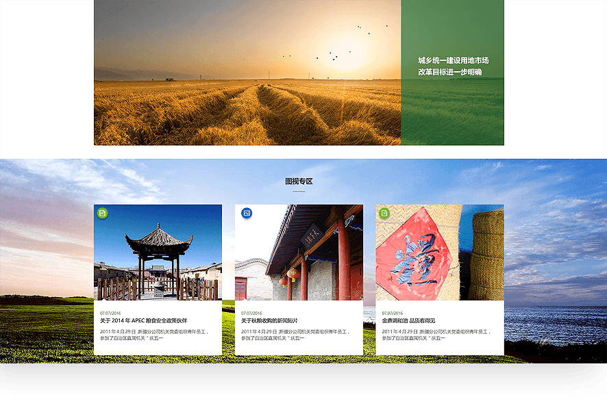 中儲(chǔ)糧官網(wǎng)采用扁平化ICON的方式,集中展示儲(chǔ)備管理、輪換購(gòu)銷、專項(xiàng)調(diào)控等多元業(yè)務(wù),在保證用戶便于閱讀的基礎(chǔ)上,通過創(chuàng)意、交互吸引用戶關(guān)注。