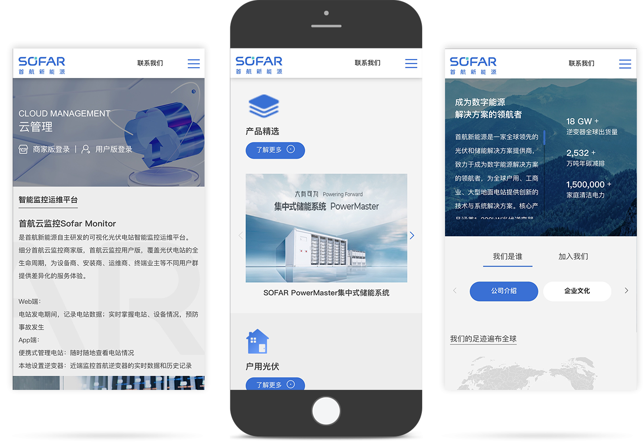 首航云監(jiān)控Sofar Monitor 是首航新能源自主研發(fā)的可視化光伏電站智能監(jiān)控運維平臺。 細分首航云監(jiān)控商家版,首航云監(jiān)控用戶版,覆蓋光伏電站的全生命周期,為設(shè)備商、安裝商、運維商、終端業(yè)主等不同用戶群提供差異化的服務(wù)體驗。