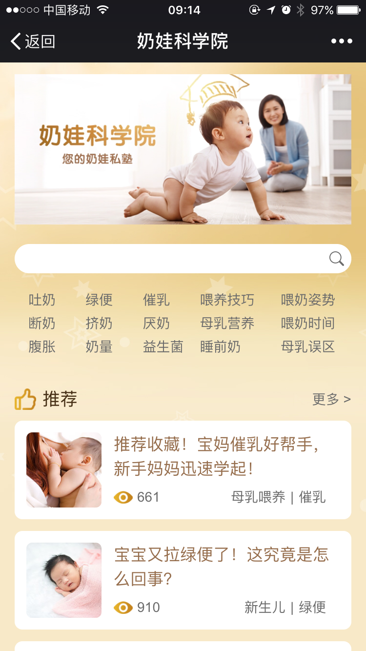 【奶娃科學(xué)院】是一檔專業(yè)知識(shí)欄目,新鴻儒通過分析行業(yè)大數(shù)據(jù)以及用戶需求,制定了整個(gè)欄目的標(biāo)簽方案,以不同緯度的關(guān)鍵詞,撰寫深度奶娃文章,帶給媽媽們更專業(yè)、更科學(xué)的答案;