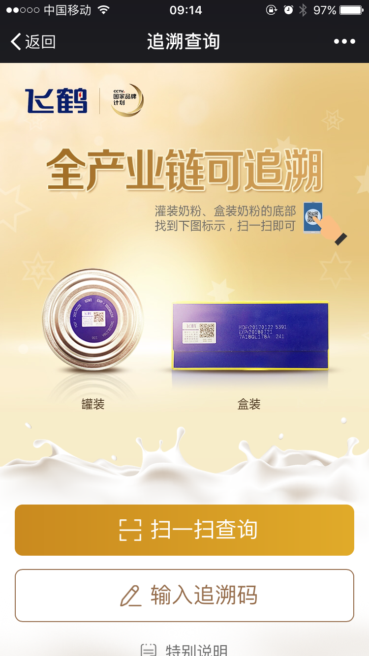 【產(chǎn)品追溯】對(duì)接產(chǎn)品生產(chǎn)系統(tǒng),支持用戶實(shí)時(shí)查詢每一罐奶粉的出處,讓寶寶喝得更放心,媽媽更安心。