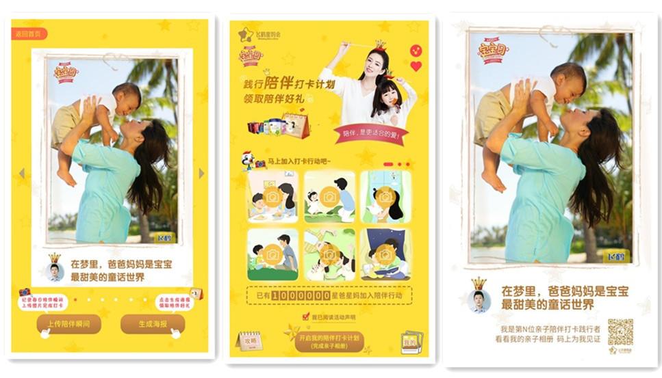 今年是飛鶴倡議“5.28中國寶寶日”的第二年,飛鶴從陪伴號召升級為陪伴指引,打造更適合的陪伴范本。通過H5互動(dòng),線上+線下有機(jī)聯(lián)動(dòng),發(fā)起了全民陪伴行動(dòng):線上陪伴習(xí)慣養(yǎng)成打卡。引導(dǎo)寶爸寶媽每天上傳自己陪伴寶寶的瞬間,即刻生成專屬海報(bào),不僅可以在社交網(wǎng)絡(luò)進(jìn)行分享、曬親子照,還可參加抽獎(jiǎng)、邀請好友助力。 7天一個(gè)循環(huán),21天養(yǎng)成陪伴寶寶的好習(xí)慣。